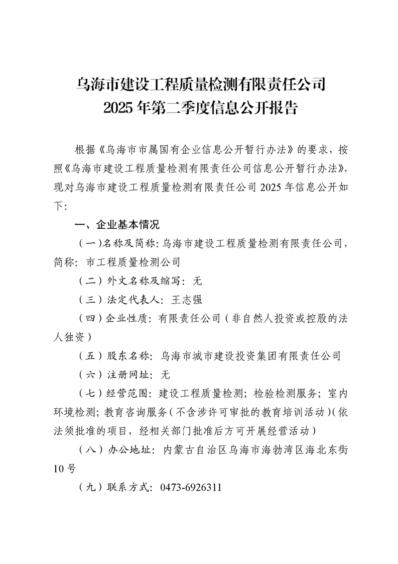 烏海市建設(shè)工程質(zhì)量檢測(cè)有限責(zé)任公司2025年二季度信息公開(kāi)