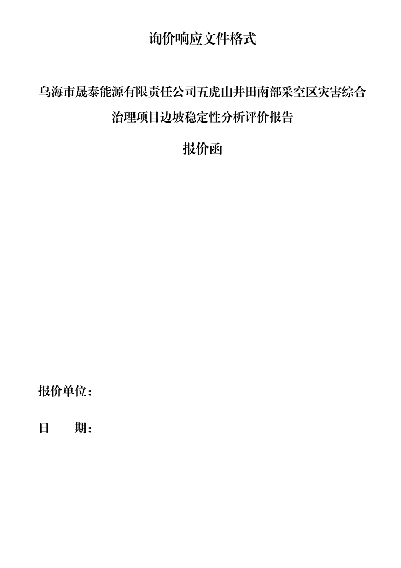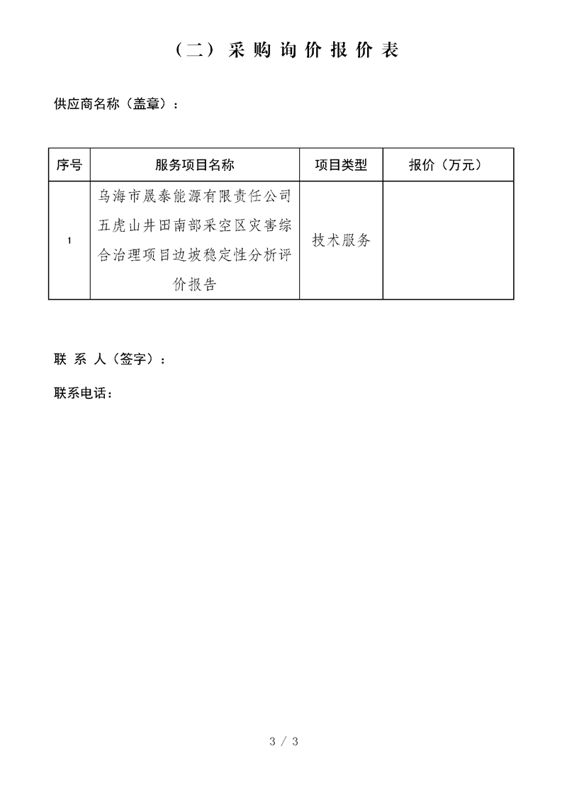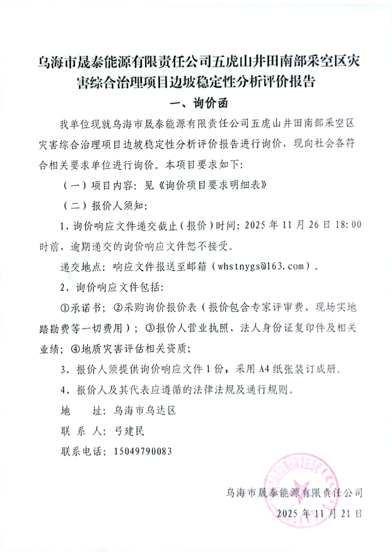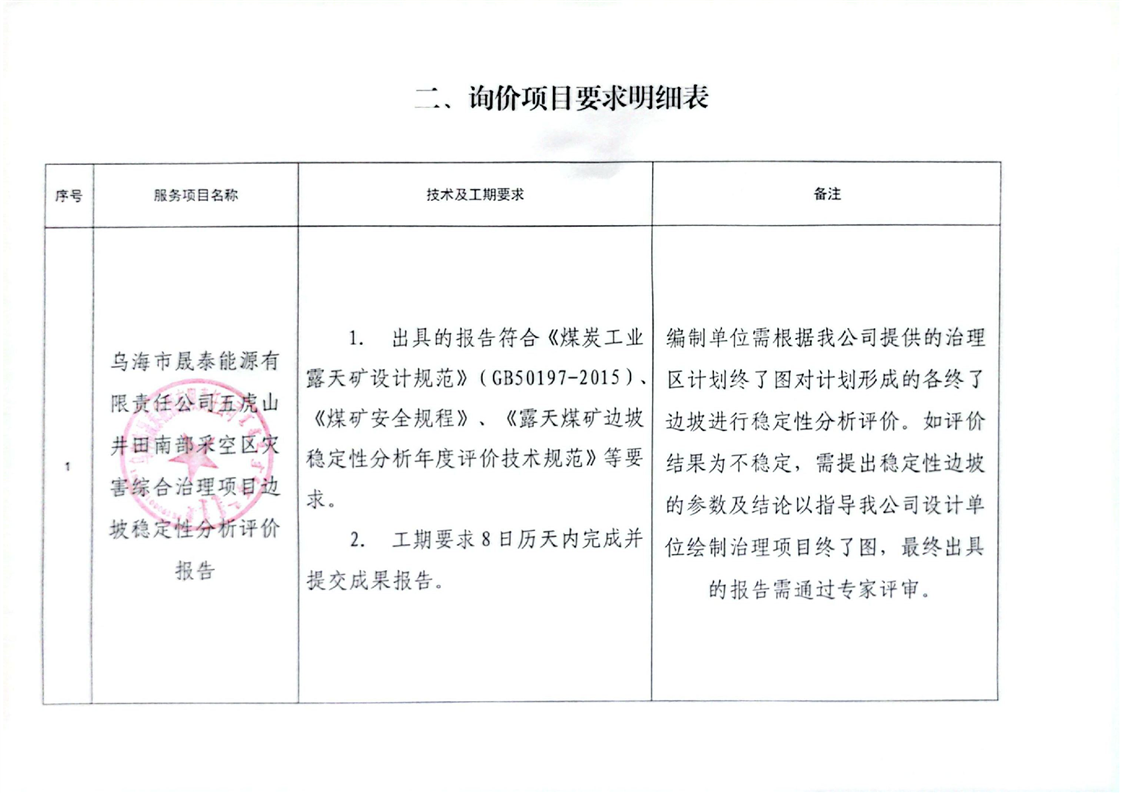 - 2025-12-16烏海市晟泰能源有限責(zé)任公司五虎山井田南部采空區(qū)災(zāi)害綜合治理項目生態(tài)環(huán)境損害司法鑒定評估項目詢價公告