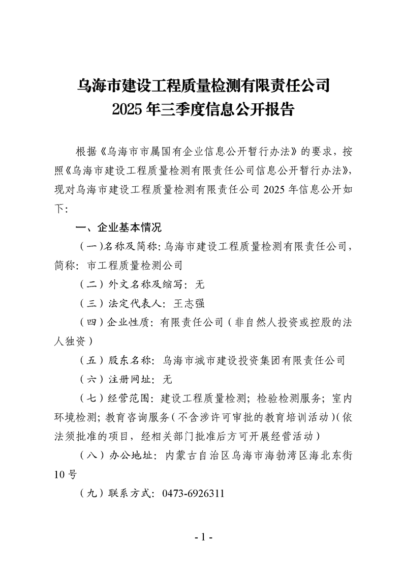 - 2025-07-28烏海市建設(shè)工程質(zhì)量檢測有限責任公司2025年二季度信息公開
